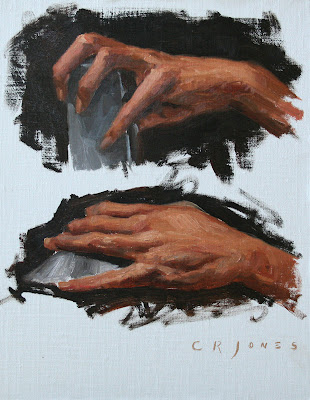 I thought I would post some of my hand studies from a class I took several years ago with Jeff Watts. We didn't focus on anatomy so much as just jumping right in doing studies from photos and the old masters' before ending the semester by working from a live hand model. Hands can be difficult, but they don't have to be if you take the right approach and keep focused. I learned two basic approaches to painting hands: The classic/Rockwell style which used a more detailed line drawing to begin the painting, or the alla prima method favored by Sargent and Fechin, which was more of a tonal block-in approach where you paint colors and shapes and refine them as you go. I ended up preferring the second alla prima method. It was more enjoyable and I liked the results of those types of paintings better.